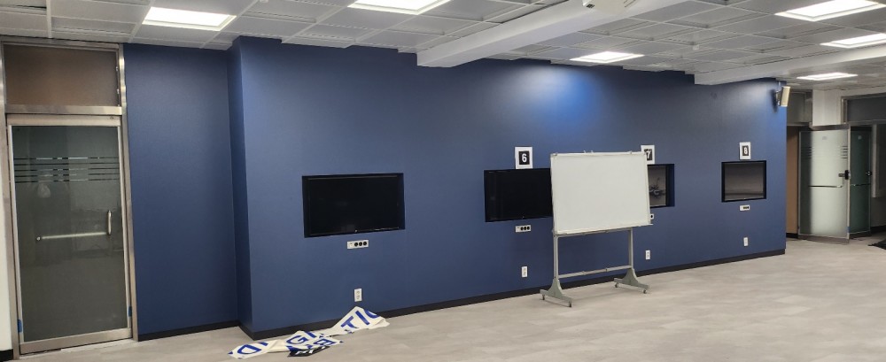 세련된 색감과 디자인으로 시원한 느낌을 많이 주고 있습니다. 특히 벽면에 모둠용 공유모니터를 매립형으로 설치한 것이 아주 좋아 보입니다.